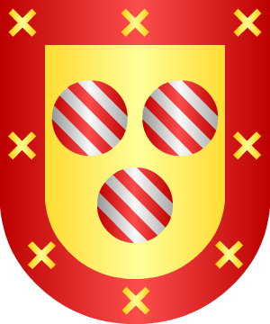 gules, con ocho sotueres de oro.